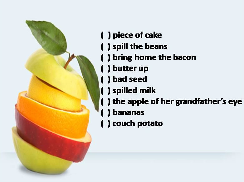 Mais um sábado chegou e junto com ele mais um exercício para praticarmos nosso inglês. Vocês já repararam que no nosso dia a dia usamos nomes de frutas ou outros alimentos para expressar certas situações? Não? Por exemplo: quando dizemos “o teste foi mamão com açúcar”, queremos dizer que o teste foi muito fácil, ou ainda “não adianta chorar pelo leite derramado”, querendo dizer que não adianta,reclamar ou se arrepender por algo que já passou, ficou para trás.