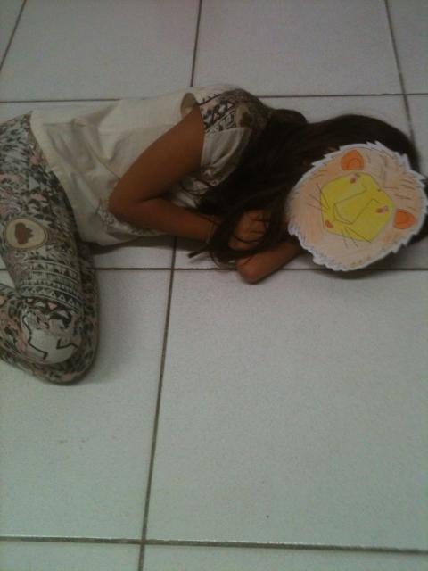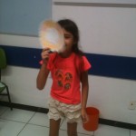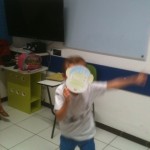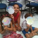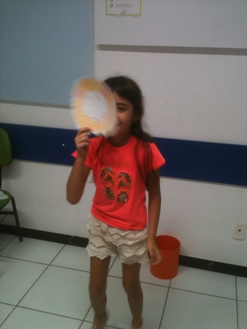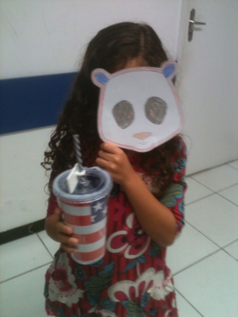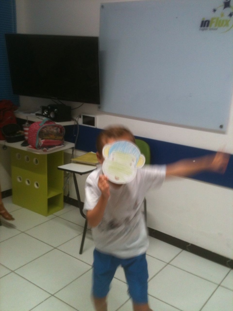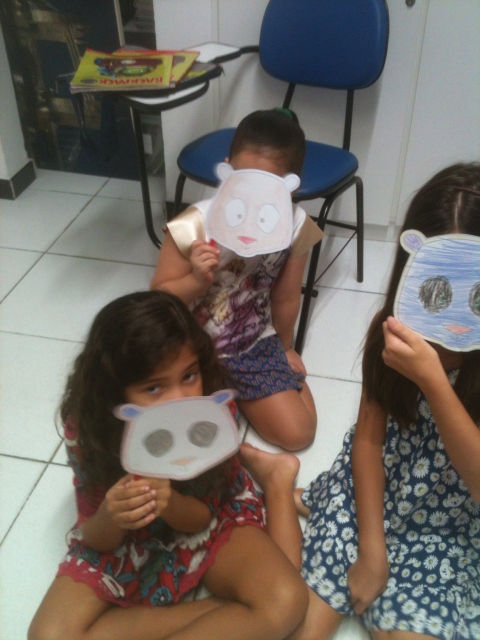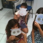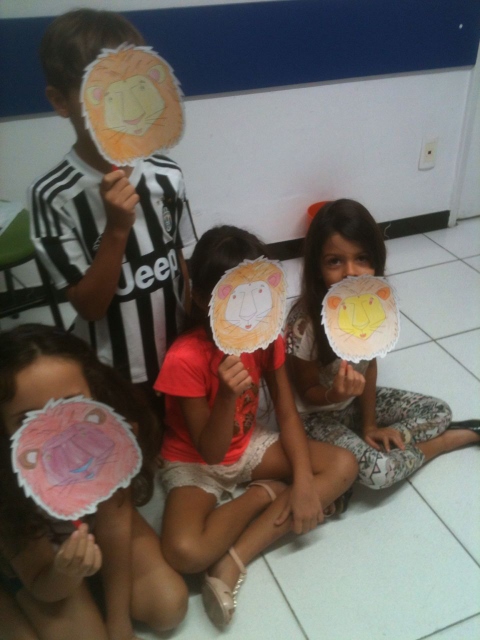 Com a máscara já pintada, os alunos colocavam-nas no rosto e diziam de que animal se tratava e alguma ação que o bichinho fazia naquela hora. Por exemplo: “The monkey is climbing”, “The bear is drinking water”, “The lion is sleeping”, “The zebra is running”, etc. Assim, a professora praticou o present continuous de uma maneira natural, legal e bem divertida!