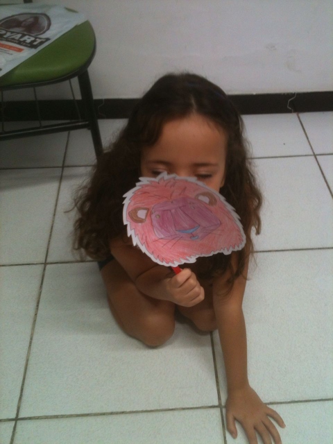 Na aula do dia 27/04, a teacher trouxe umas máscaras dos bichos e os alunos pintaram de acordo com seu gosto. Foi muito divertido, pois teve ursos azuis, rosas, macaquinhos multicoloridos, etc.