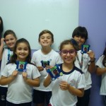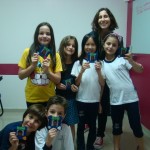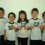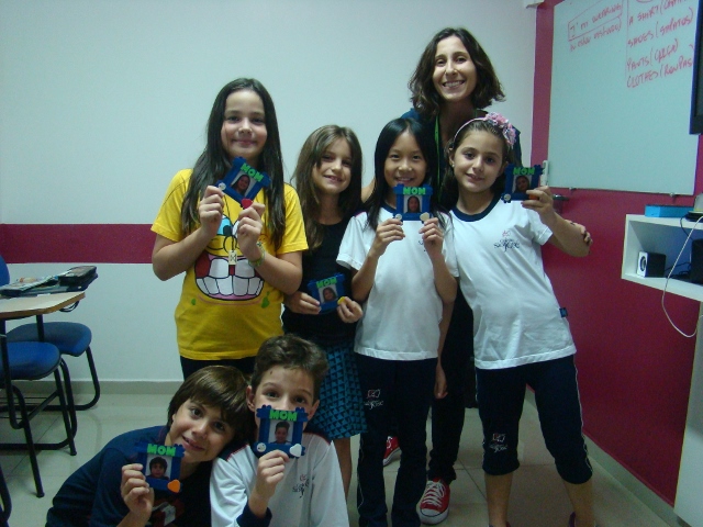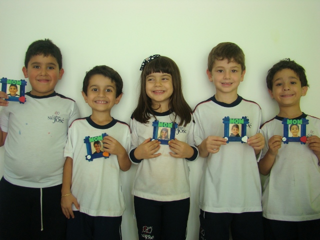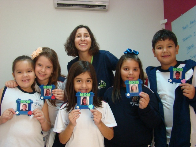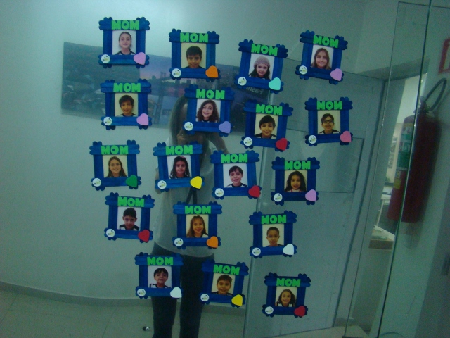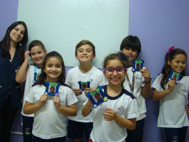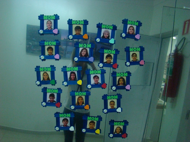 O presente foi um imã de geladeira com a foto de cada aluno para deixar de lembrança em um dia especial como este. Junto com o imã, os alunos entregaram um lindo cartão escrito em inglês para as mamães.
