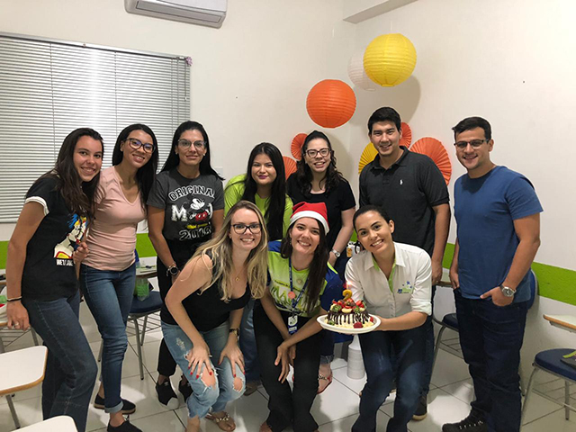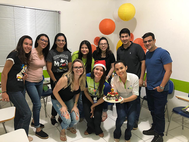 Os teachers e toda a equipe da unidade, depois de um longo bate-papo e feedbacks sobre o semestre, sopraram as velinhas da escola em comemoração a mais um ano.