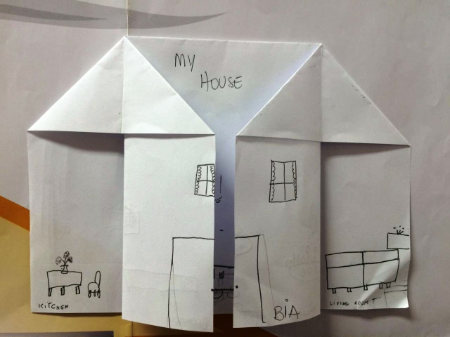 Que projeto legal! Na aula do dia 31/06, a teacher trouxe uma folha de papel em formato de casa e os alunos desenharam os cômodos e até mesmo os móveis. Ao finalizar a aula, todos sabiam MUITO vocabulário e foi aí que começaram a soltar frases em inglês! As vozes eram música para os ouvidos de quem escutava.