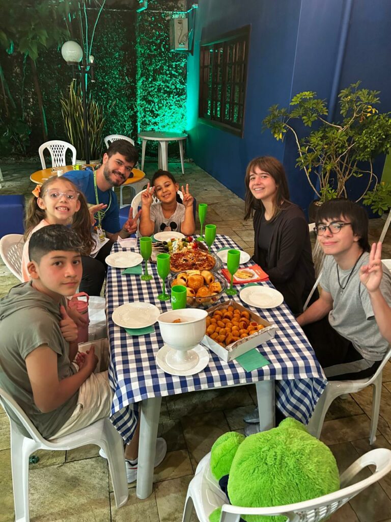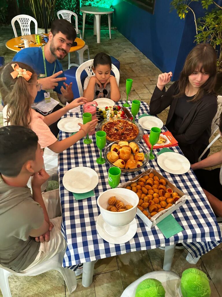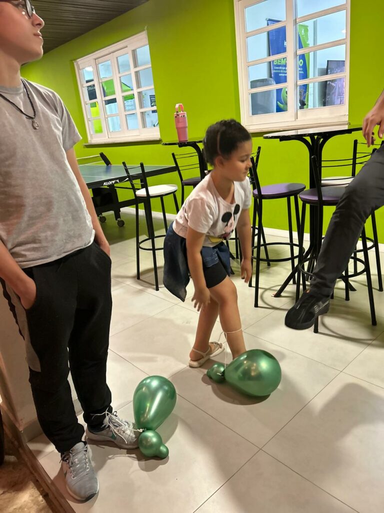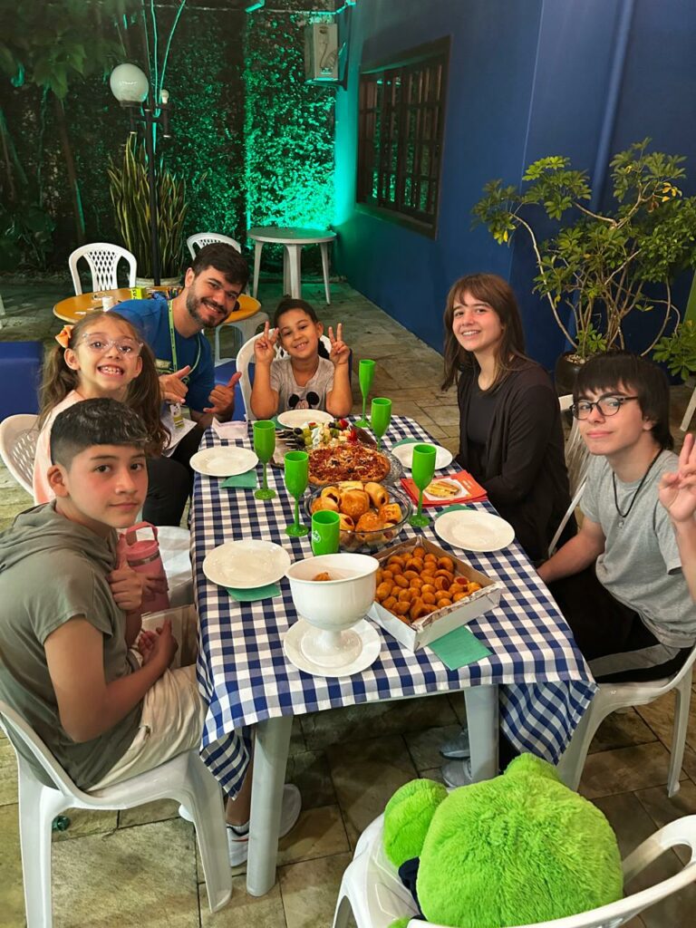 Os alunos também participaram do Turkey Tag, em que tentaram estourar a bexiga decorada de turkey dos colegas enquanto protegiam as suas. E, para finalizar, tiveram o tradicional jantar de Ação de Graças, para que pudessem experimentar o espírito do Thanksgiving, compartilhando comidas entre si e dizendo “I’m thankful for…”.