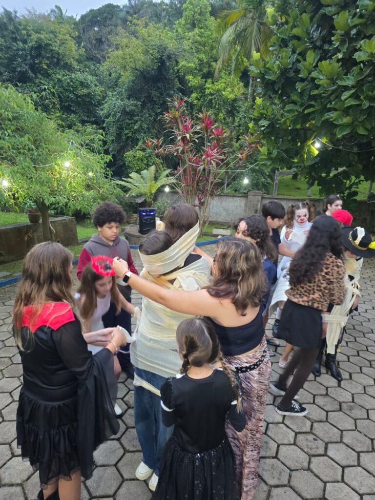 Durante a festa, os alunos colocaram o inglês em prática em atividades assustadoramente divertidas, como o Halloween Quiz e o Jogo de Charadas Fantasmagórico, que garantiram boas risadas e momentos de aprendizado. Também teve a famosa “Corrida da Múmia” e a oficina “Crie sua Própria Múmia”, que despertaram o espírito criativo dos participantes.
