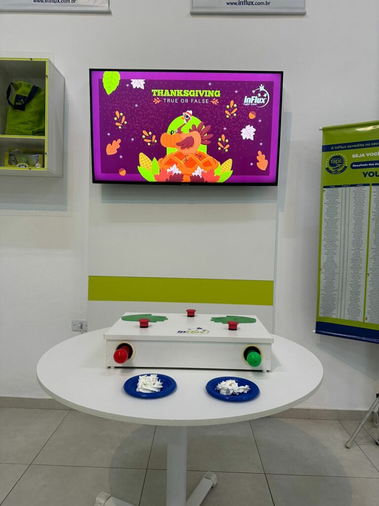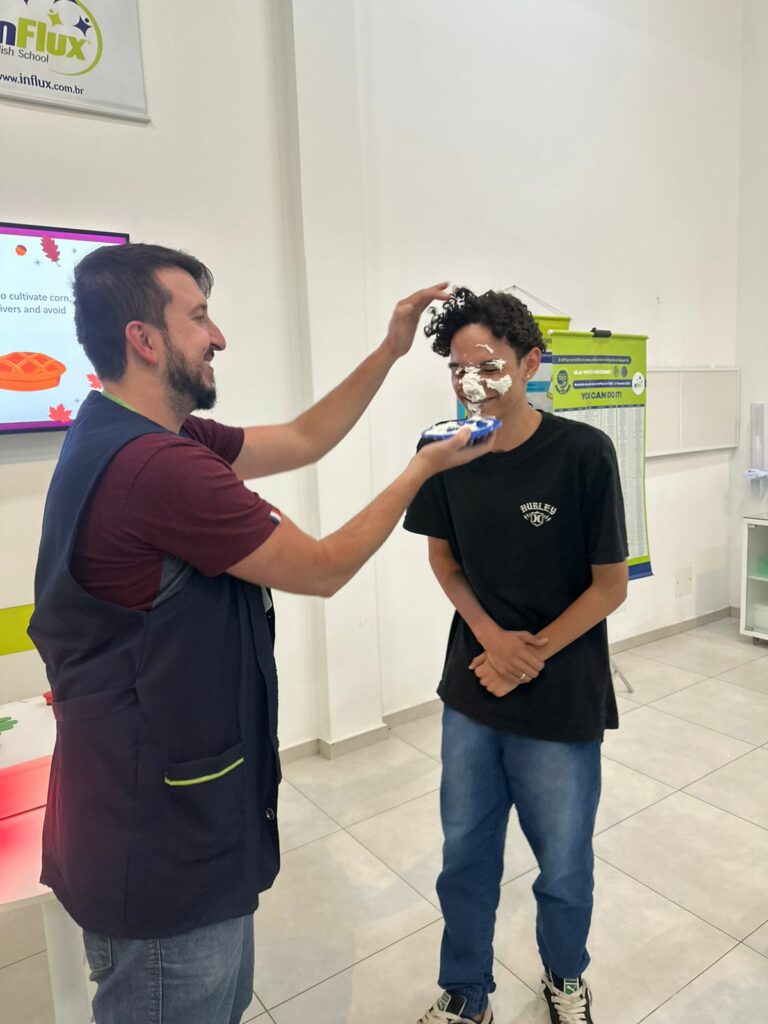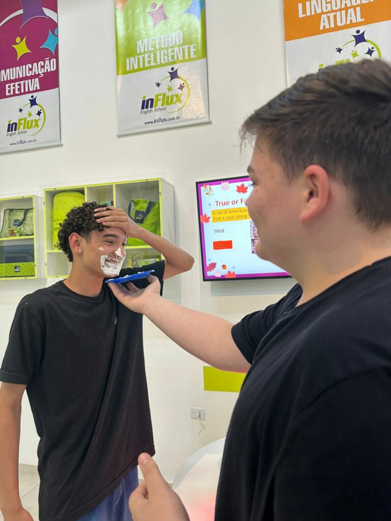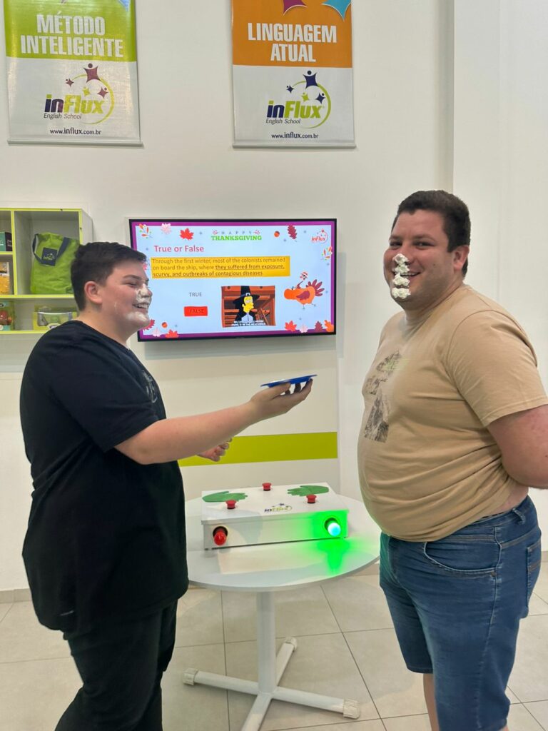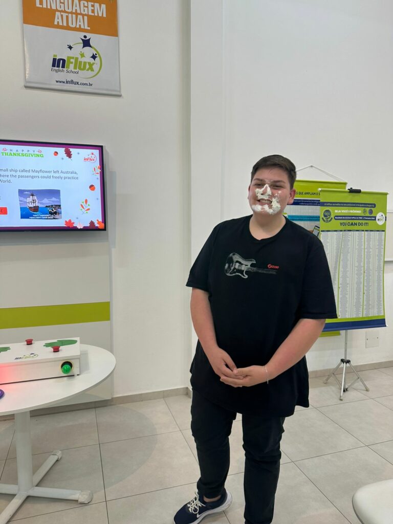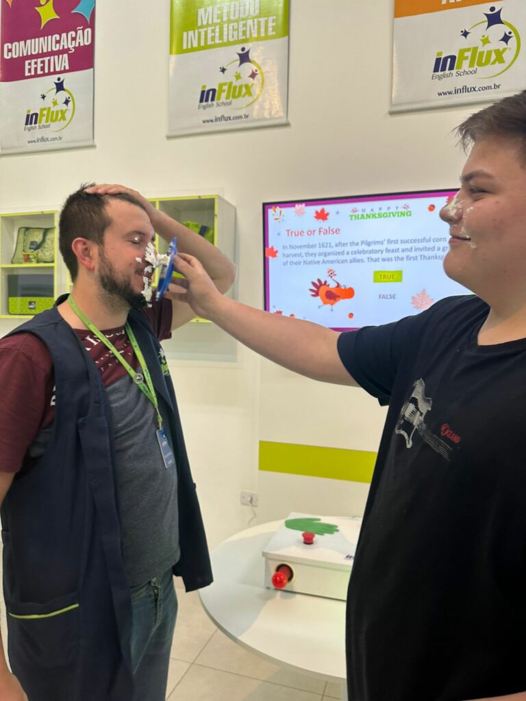 Os alunos entraram no clima do Thanksgiving com atividades temáticas, curiosidades sobre a data e, claro… a brincadeira mais esperada da noite: Torta na Cara!