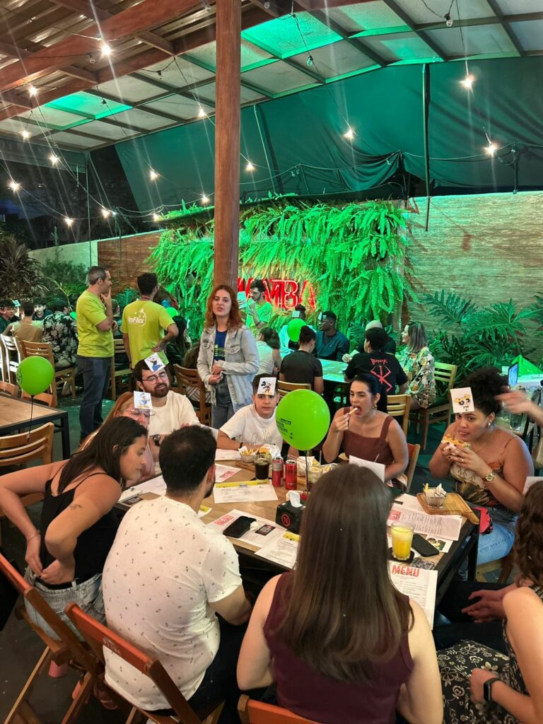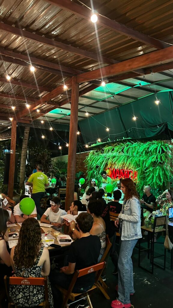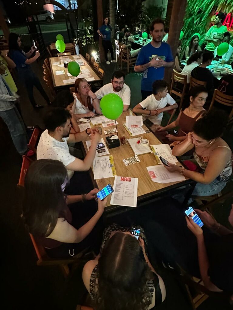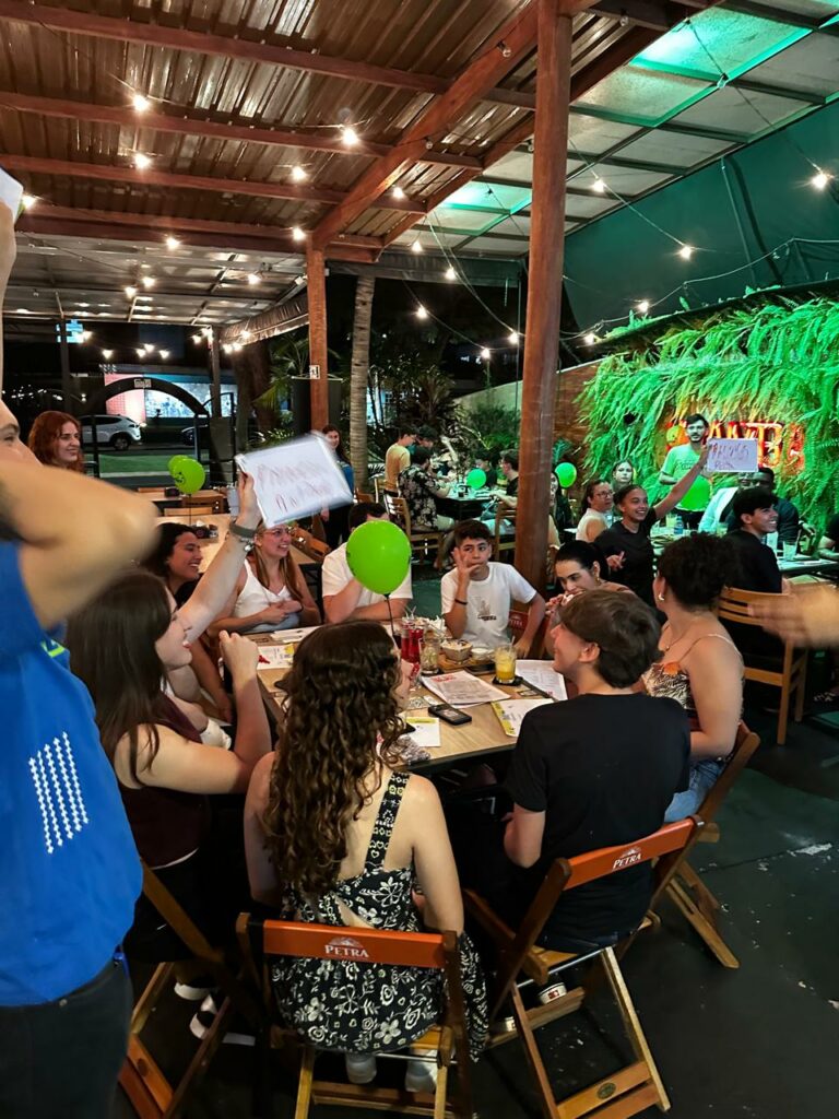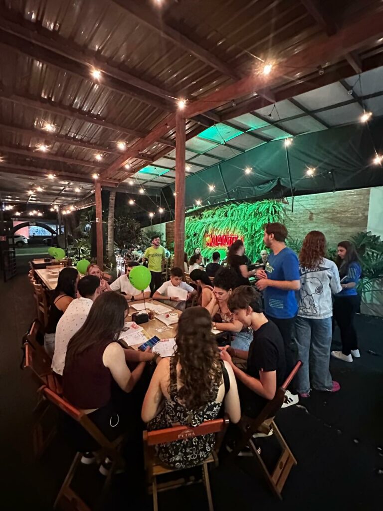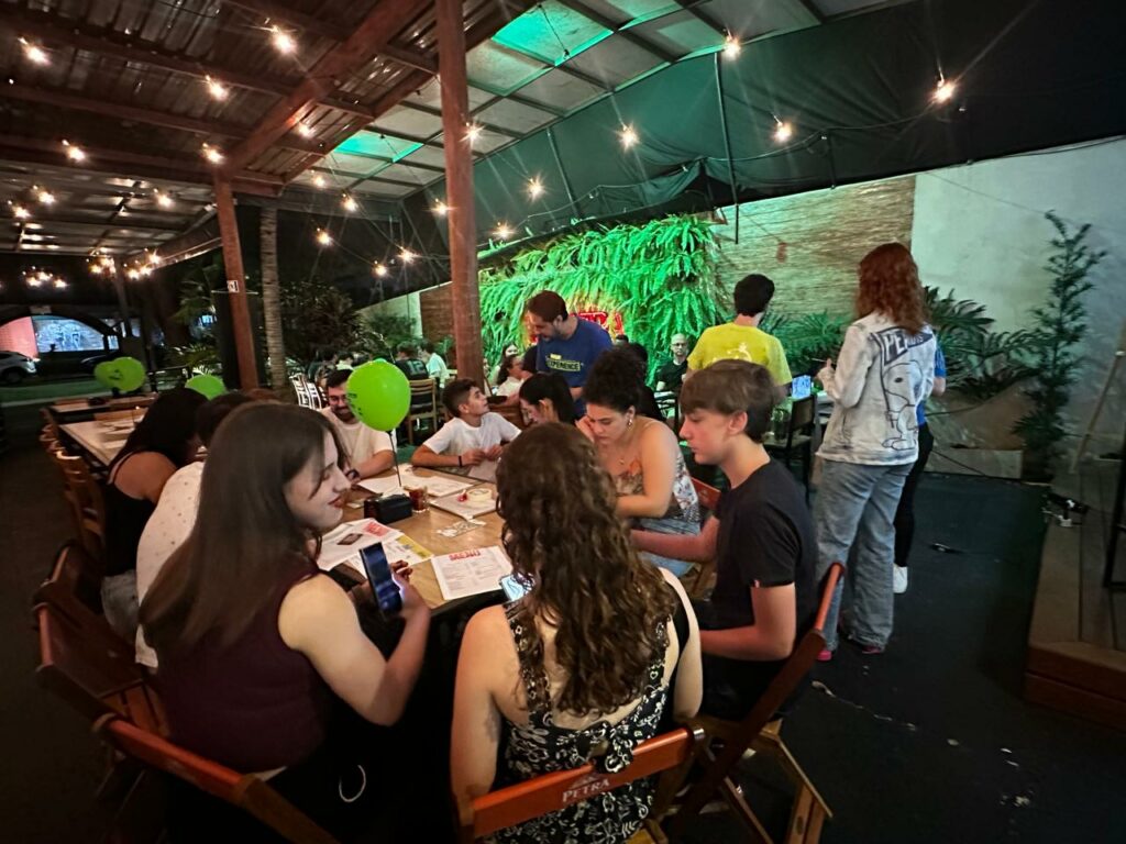 Durante a atividade, os participantes se envolveram em jogos de adivinhação, desfrutaram de uma trilha sonora especial e praticaram situações reais do cotidiano ao fazer pedidos de comida e bebida em inglês. As mesas foram divididas em equipes, criando um clima saudável de competição, no qual os grupos interagiram, disputaram pontos e demonstraram suas habilidades no idioma.