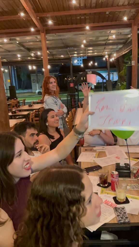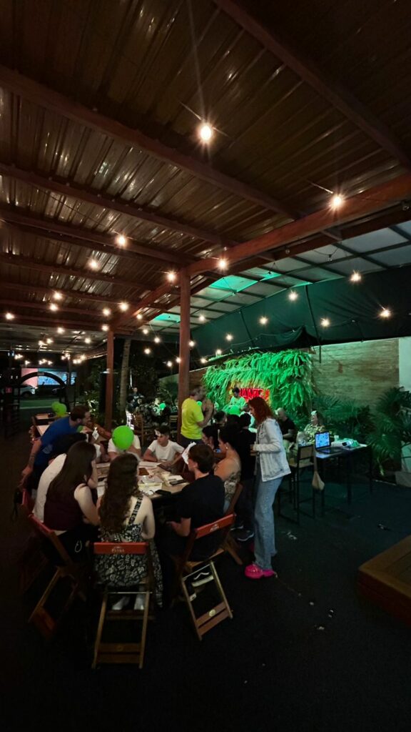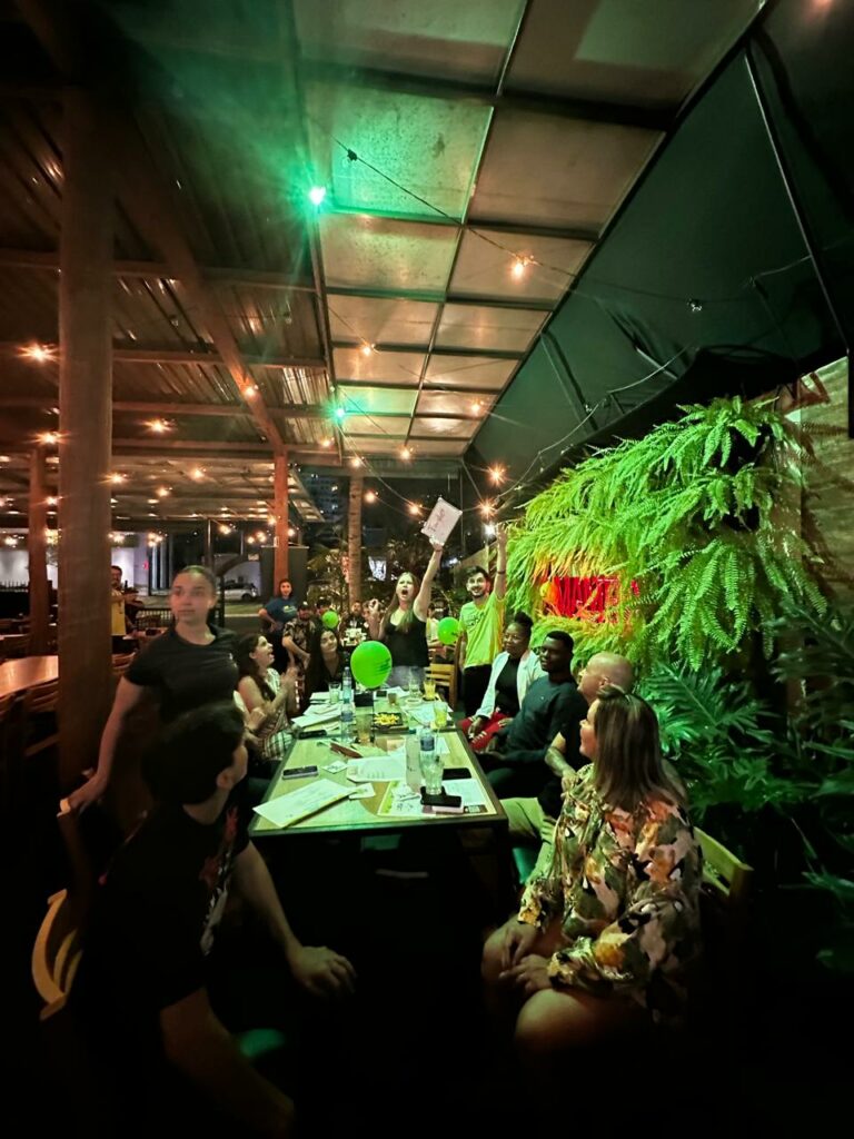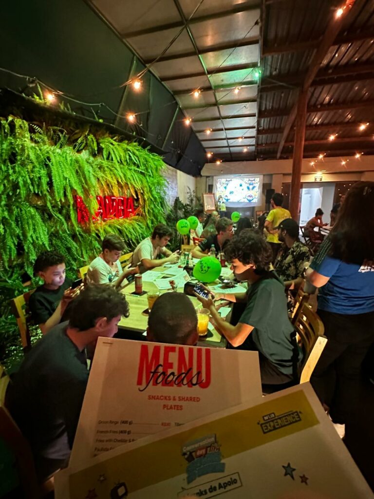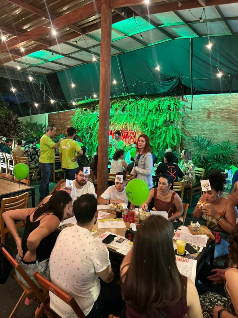 Durante a atividade, os participantes se envolveram em jogos de adivinhação, desfrutaram de uma trilha sonora especial e praticaram situações reais do cotidiano ao fazer pedidos de comida e bebida em inglês. As mesas foram divididas em equipes, criando um clima saudável de competição, no qual os grupos interagiram, disputaram pontos e demonstraram suas habilidades no idioma.