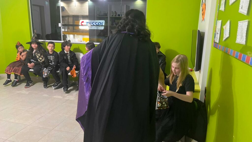 A atividade também contou com brincadeiras temáticas, como o animado Mummy Bowling e o tradicional Trick or Treat, que ajudaram a colocar todos no clima da data e reforçaram a importância de aprender inglês de forma prática e significativa.