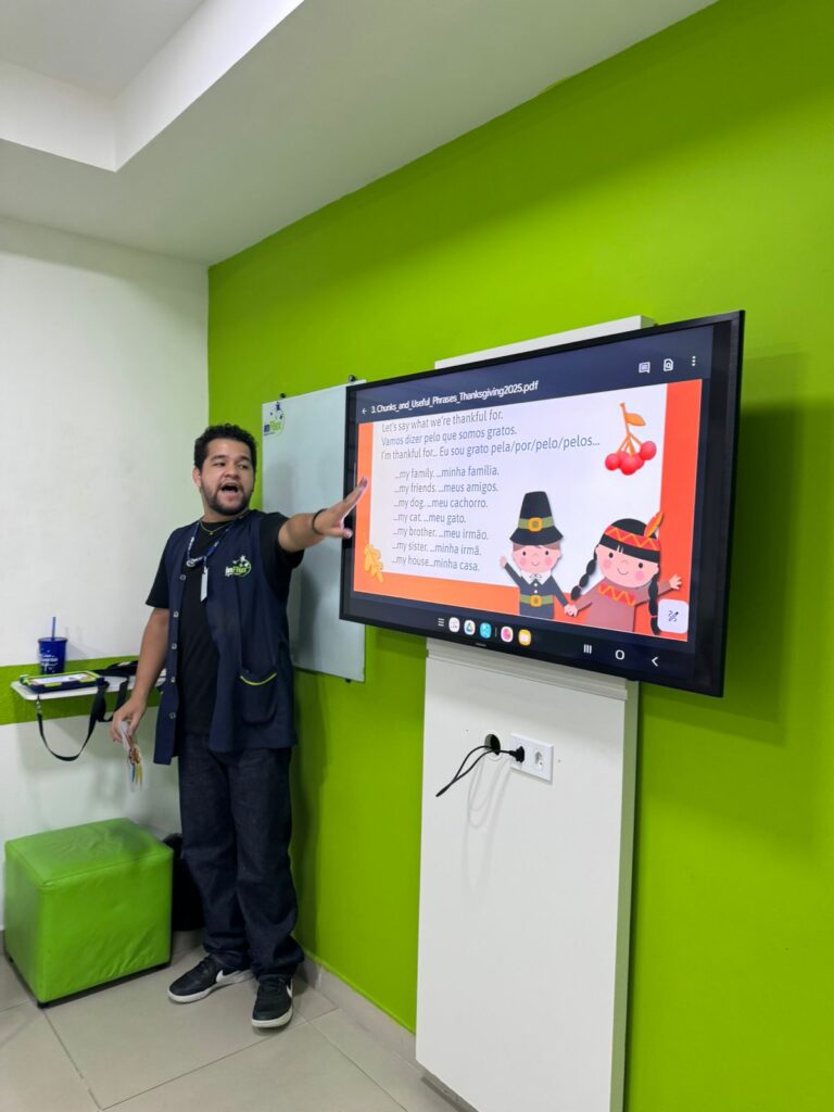 Durante a atividade, os alunos aprenderam sobre a história do Thanksgiving, explorando o contexto em que surgiu e a importância dos valores de gratidão, união e partilha. Também participaram de dinâmicas que incentivaram a expressão de agradecimentos, promovendo reflexões sobre pessoas, momentos e conquistas pelas quais se sentem gratos.