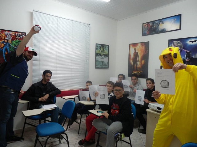 A segunda atividade foi para aprender a reconhecer os Pokémons em inglês. Ainda divididos em equipes, os professores colocaram um vídeo que perguntava “Who’s that Pokémon?” e os alunos tinham que responder também em inglês. A equipe com maior número de acertos foi a vencedora da turma.