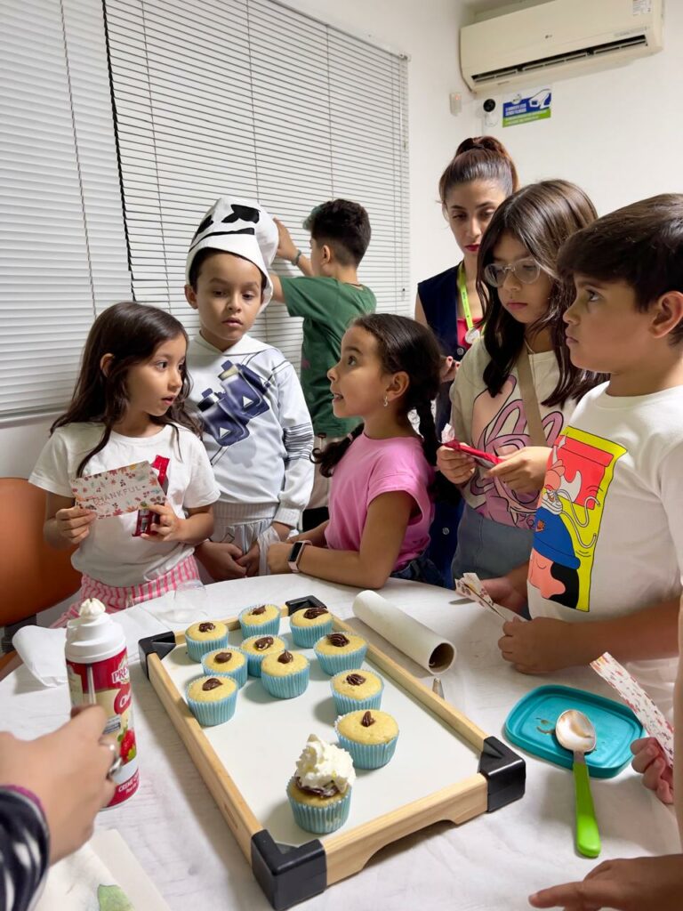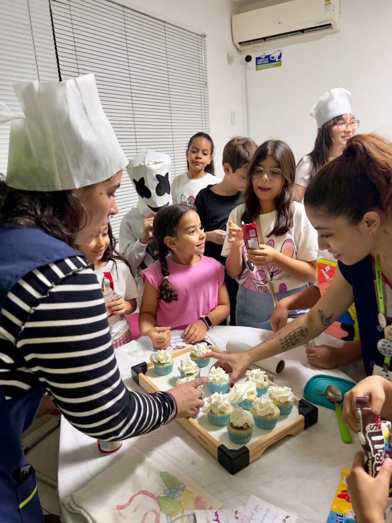Na Atividade Extra, os alunos colocaram a mão na massa e prepararam cupcakes do zero, passando por todas as etapas da receita enquanto praticavam o inglês de forma natural e envolvente. Durante a atividade, também aprenderam mais sobre a cultura e o significado dessa data tão importante nos Estados Unidos, tornando o aprendizado ainda mais completo.