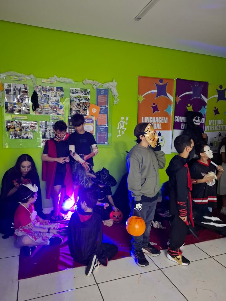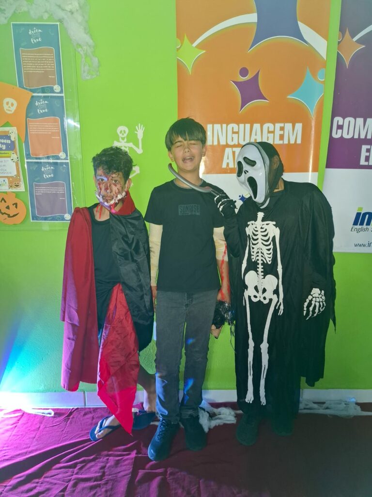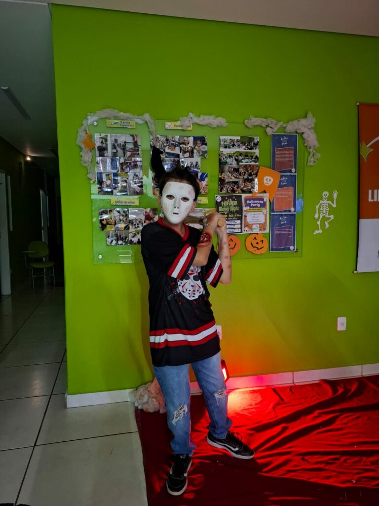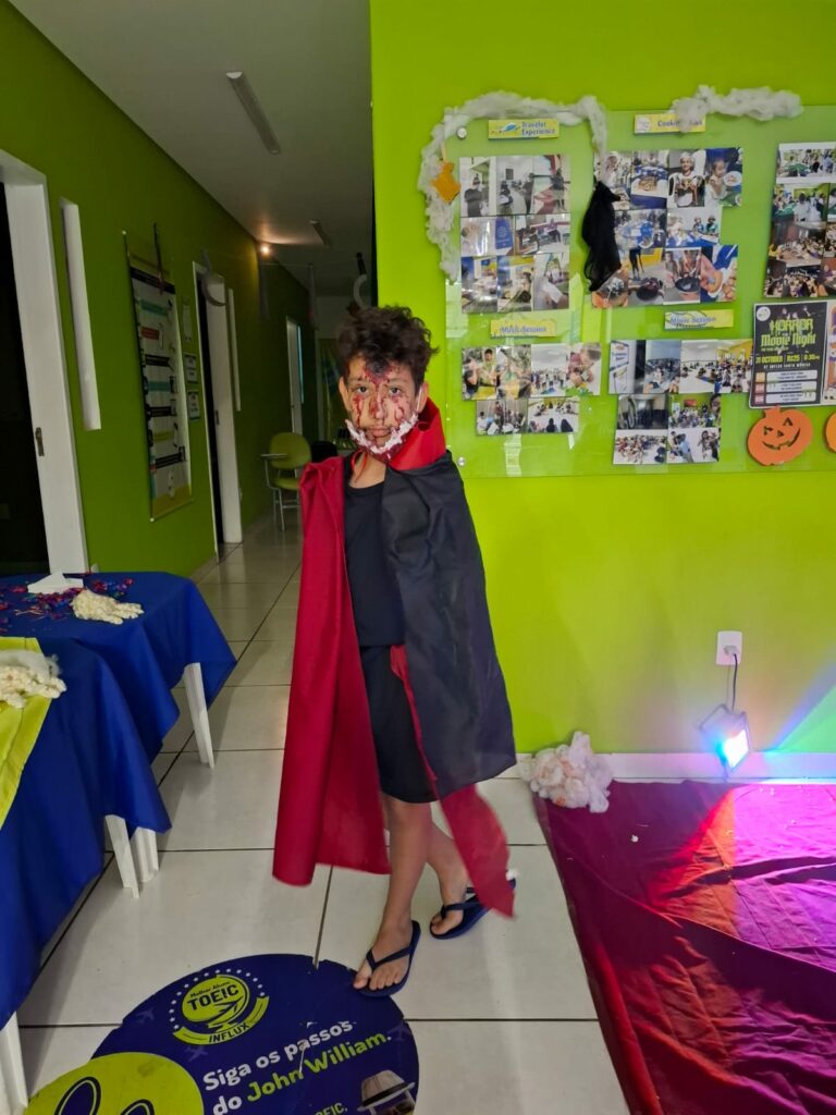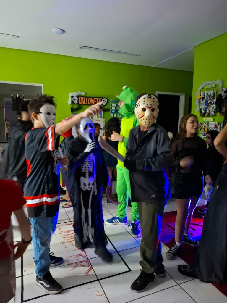 Tivemos dois eventos rolando ao mesmo tempo: para as turmas Kids e Juniors, a noite foi de pura energia, com brincadeiras, concurso de fantasias, doces, bingo e muita risada. Já o pessoal Teens e Adults mergulhou no clima com um concurso de fantasias cheio de criatividade e uma sessão de filmes de terror que foi demais!