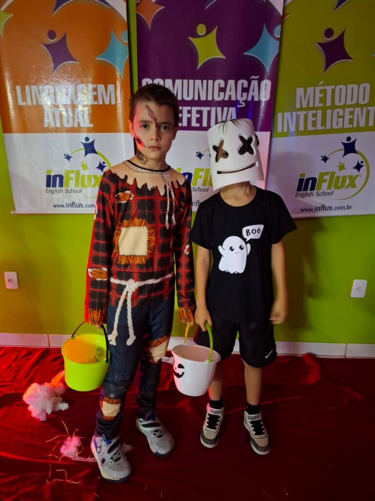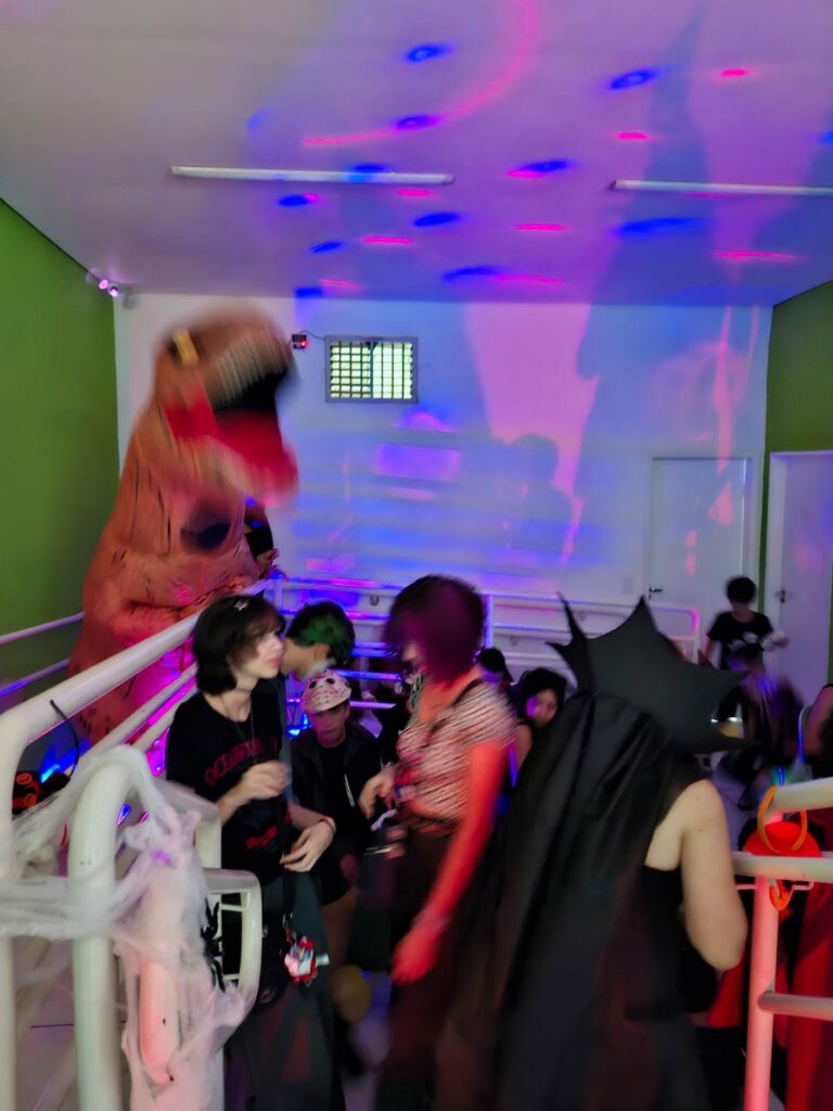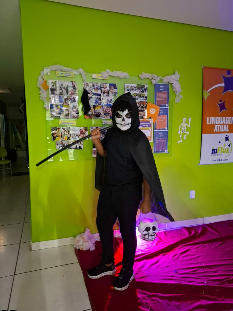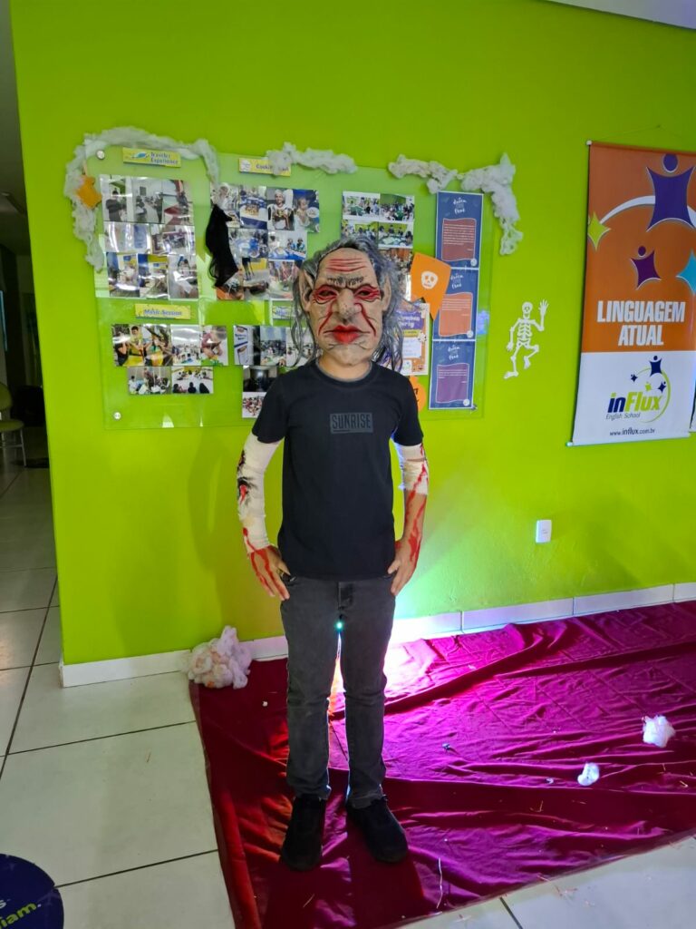 O ambiente estava todo decorado, com comidas temáticas, luz baixa, sons assustadores e muita conversa em inglês — afinal, na inFlux, até os fantasmas praticam o idioma!