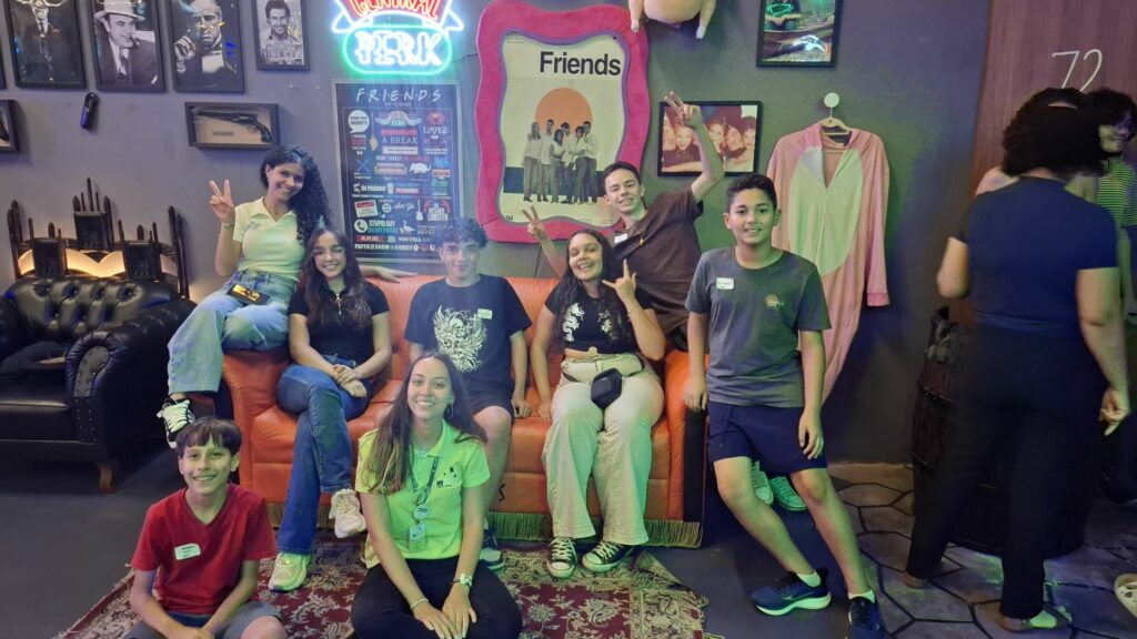 O tema escolhido foi Cartoons and Animations e incluiu diversas atividades, como quiz para identificar semelhanças com personagens, aprendizado de chunks e expressões para falar sobre filmes e desenhos favoritos, além da experiência de realizar pedidos em inglês, como em um restaurante internacional.
