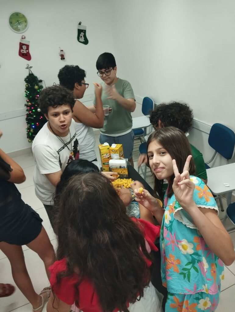 A proposta contou com uma versão natalina, em inglês, do jogo Cidade Dorme, permitindo que os alunos entrassem no clima de fim de ano enquanto praticavam o idioma de forma leve e envolvente. A dinâmica estimulou a participação, a comunicação e o aprendizado em um ambiente descontraído.
