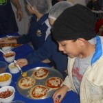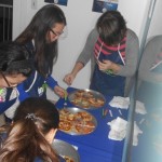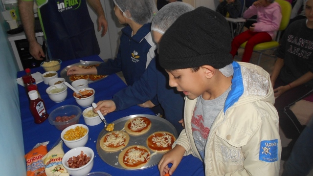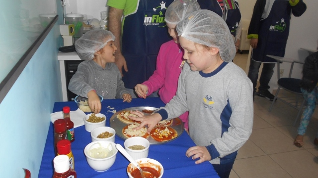 Os alunos prepararam as pizzas em grupos e cada grupo teve 30 segundos para montar e decorar suas pizzas. Depois o próximo grupo melhorava e complementava as pizzas da sua própria equipe, dessa forma os alunos fizeram da preparação um momento de interação e trabalho em equipe. Além das pizzas, foram realizadas atividades de perguntas e respostas sobre o vocabulário apresentado e puderam praticar o que aprenderam dentro da sala!