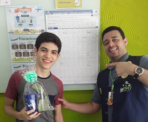 1º lugar: Paulo Vitor – Aluno do “Book 2”, aos sábados, das 08:30 às 10:45, da teacher Mariana – Ganhou um inFlux Mug (caneca).