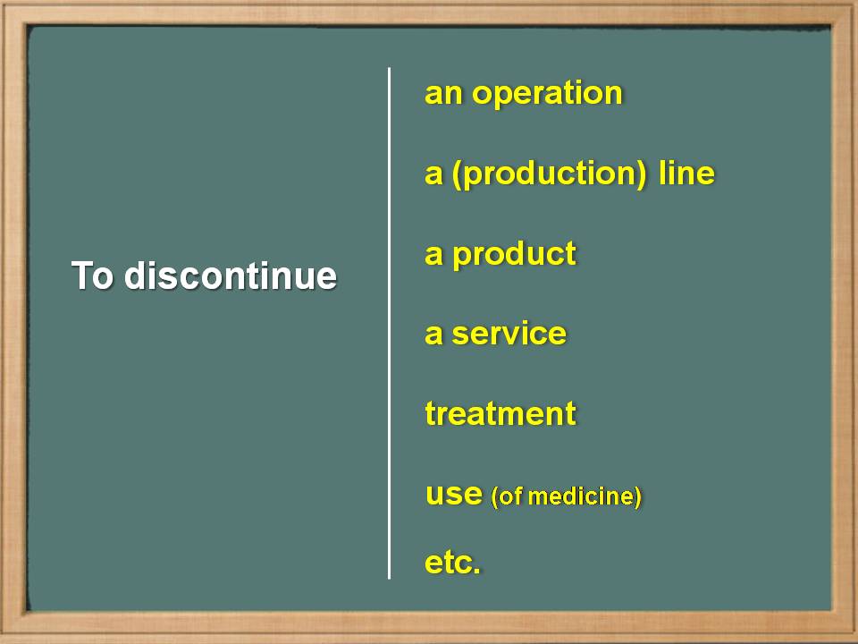 Então, para expressar em inglês a ideia de um produto não ser mais fabricado, ser ‘descontinuado’, ser interrompido, ou ainda ser tirado de linha, é possível usarmos o verbo “to discontinue”, que também pode ser usado quando um produto ou serviço não está mais disponível no mercado e também para tratamentos médicos, como interromper um tratamento.