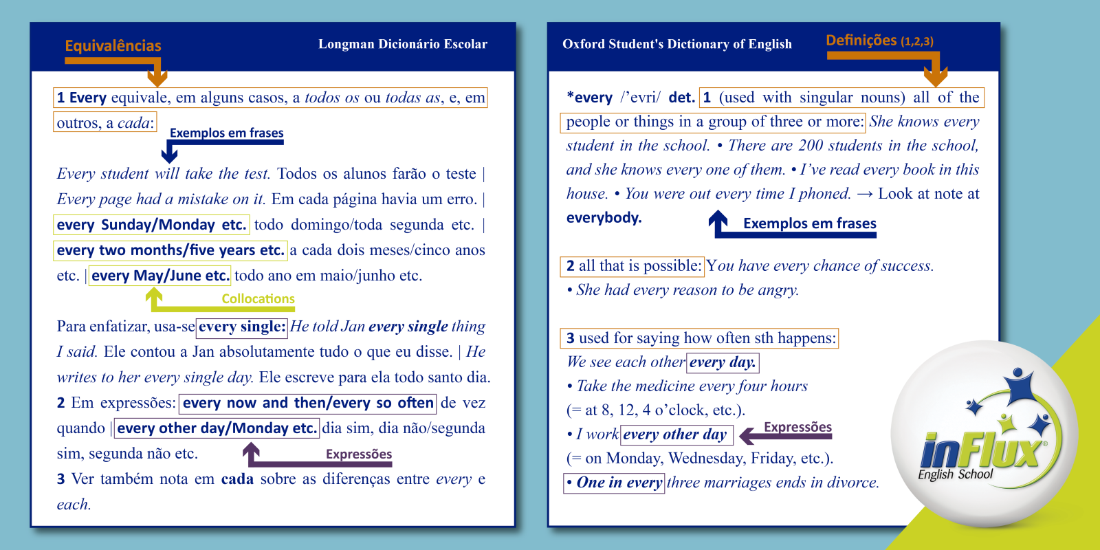 Como já falamos aqui no Blog, a melhor forma de aprender o idioma é aprendendo chunks of languages – combinações de palavras. Então, ao pesquisar uma palavra no dicionário, busquem todas suas equivalências, collocations, preposições que geralmente a acompanham, expressões com essa palavra e não somente a palavra solta. Dessa forma, é possível enriquecer o vocabulário e saber como usar as palavras aprendidas.
