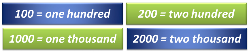 Como vocês já sabem, no inglês usamos Hundred para as centenas e Thousand para os milhares. Ou seja :