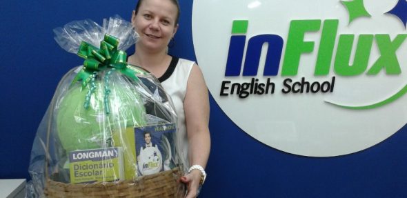 Entre os alunos que fazem renovação antecipada, sorteamos uma kit de produtos influx composto por dicionário, Fluxie de pelúcia, fone personalizado, mochila e guarda chuva inFlux.