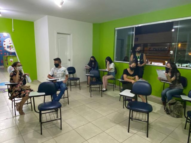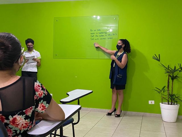 Alunos da inFlux Fazenda Rio Grande praticam inglês através de situações do cotidiano de um escritório.