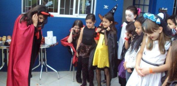 Outra foi a Witch’s stew (poção mágica da bruxa), onde os alunos tiveram que fazer uma poção mágica e os ingredientes eram aranhas e “bats”. Entre as outras brincadeiras teve também o Find the bat (caça aos morcegos) onde os alunos foram a caça de “bats” que estavam escondidos pela escola. As crianças capricharam nas fantasias e praticaram muito o inglês aprendido nas aulas e para finalizar o dia de Halloween as crianças fizeram o “Trick or Treat” e se deliciaram com muitos “candies”.