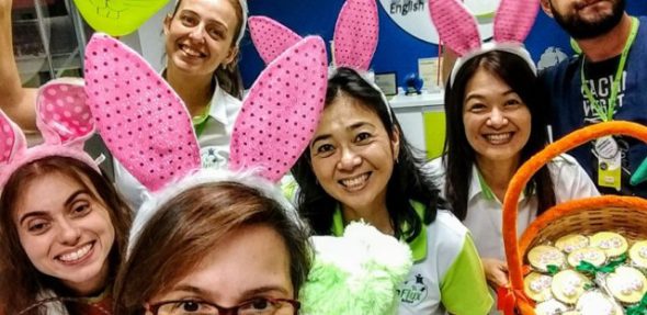 Para comemorarmos a Páscoa de forma bem alegre e deliciosa, nosso Easter Bunny entrou na sala de aula de nossos pequenos propondo desafios em inglês após uma gostosa brincadeira com balões e… claro… para quem cumpriu os desafios, foi dado como prêmio um delicioso
