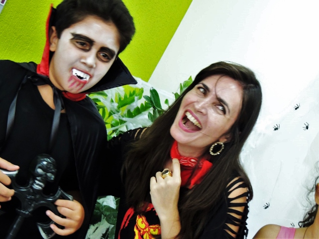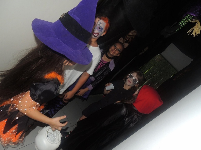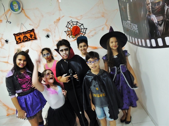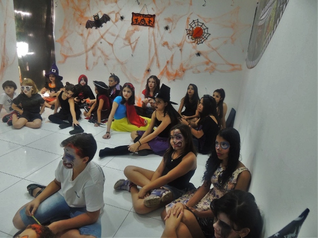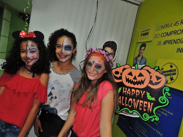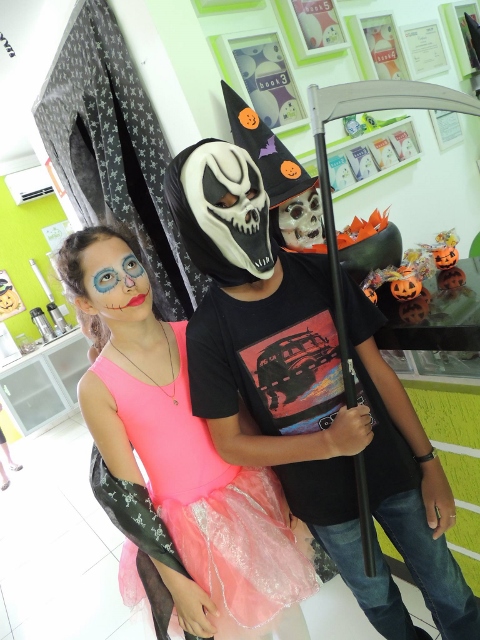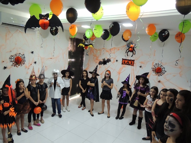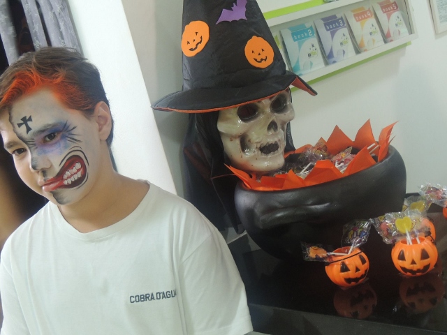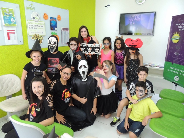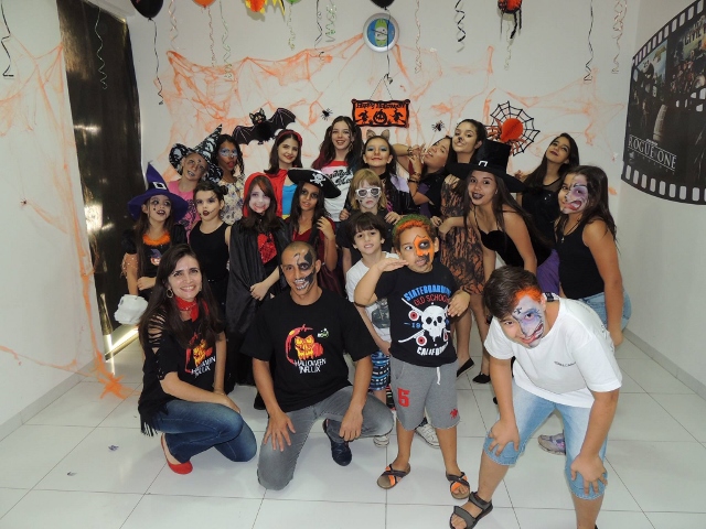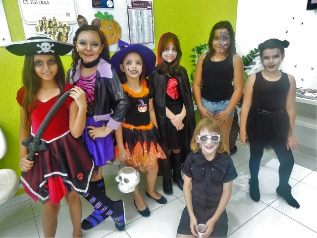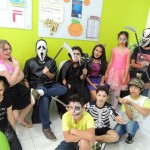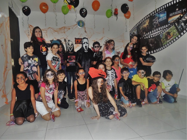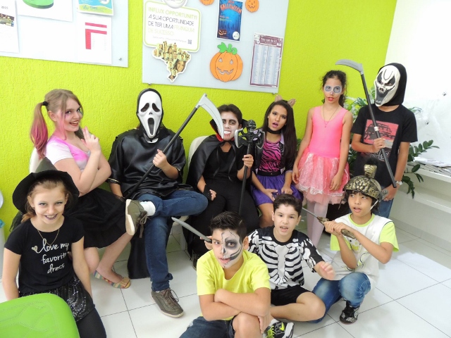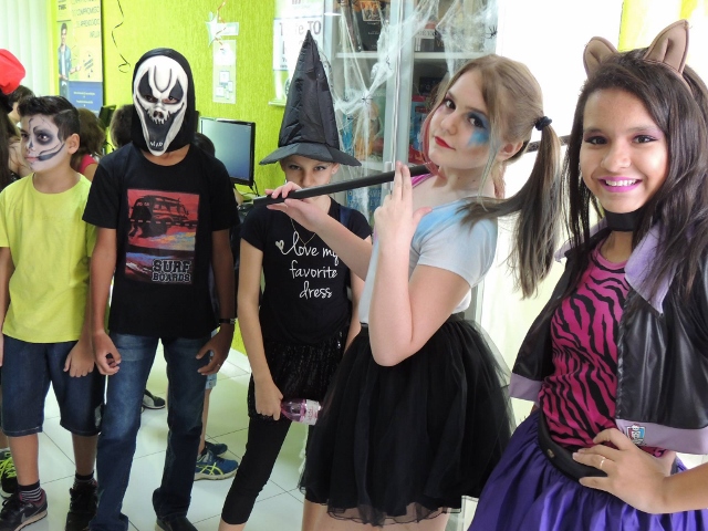 Durante todo o dia, nossos alunos participaram várias atividades divertidas, em que eles puderam praticar o inglês e se divertir muito. Caracterizados com fantasias de monstros, fantasmas e bruxas, bem como escondidos atrás de máscaras assustadoras, também aprenderam mais sobre a cultura do Halloween e como utilizar a expressão “trick or treat”.
