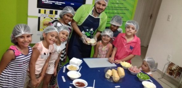 Outra atividade que movimentou a escola foi a Cooking Class FLUXWAY, onde os alunos aprenderam como pedir e montar um sanduíche tipo subway. Eles puderam aprender os ingredientes em inglês e escolhiam os que mais gostavam. Todos os participantes aprenderam se divertindo muito!