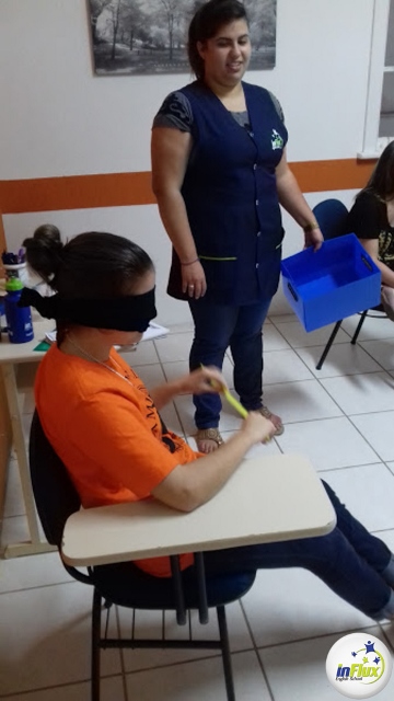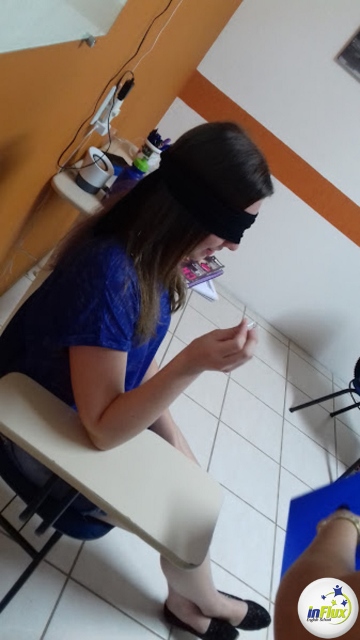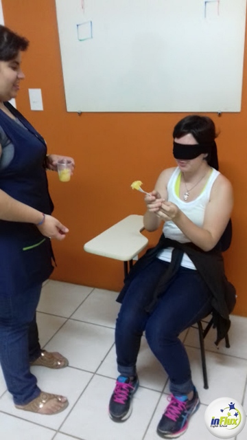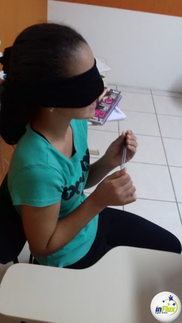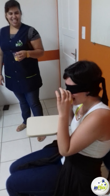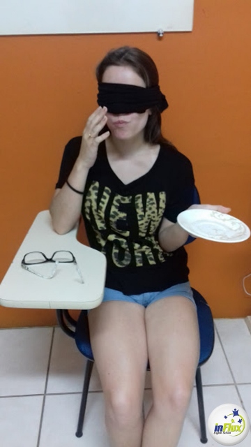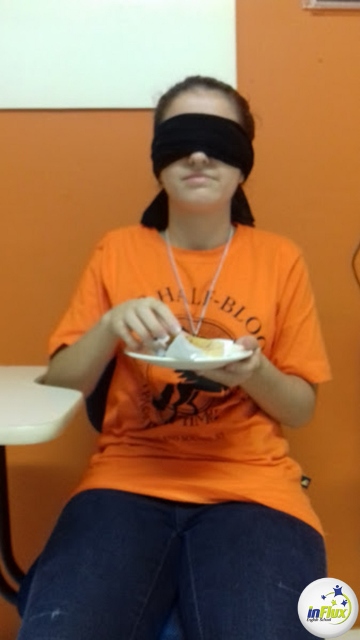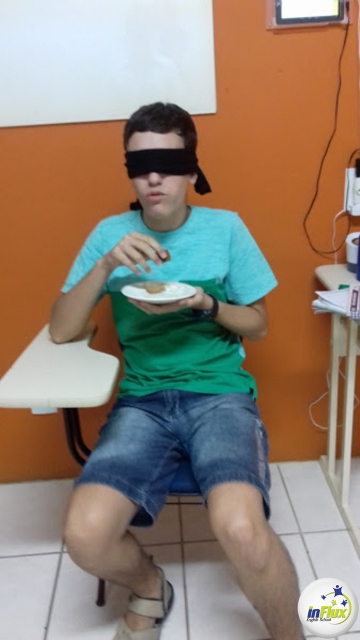 Com os olhos vendados, os alunos experimentaram comidas e bebidas, sentiram aromas, e tocaram objetos com o intuito de marcarem pontos para seus times.