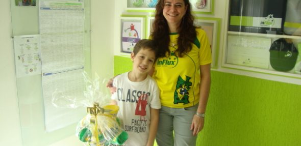 Agora ele está preparado para a festa da Copa do Mundo para torcer pela nossa Seleção, afinal, ganhou de presente um kit (Kit Barulho como foi carinhosamente batizado pelos nossos alunos) com vários itens para comemorar todos os gols do Brasil!
