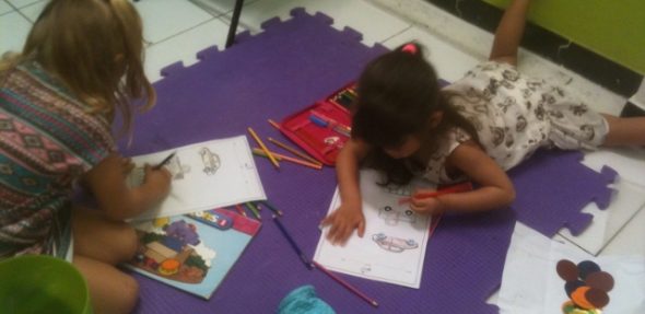 O desafio foi colorir e colar todas as figuras apresentadas: school, bus, truck and car. Além disso, teacher Denise revisou combinações com algumas palavras que elas já tinham estudado nas aulas passadas como: big, circle and small.