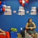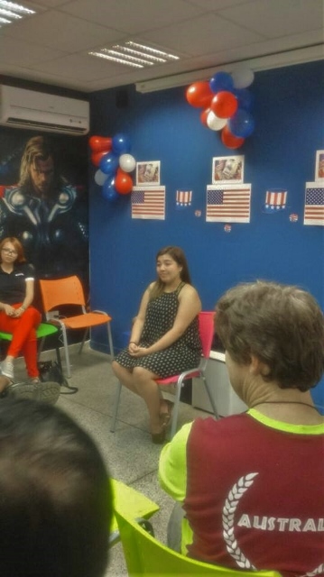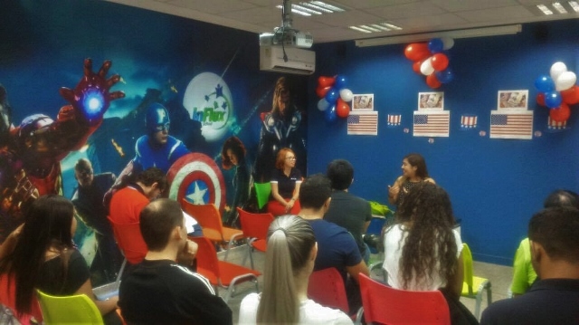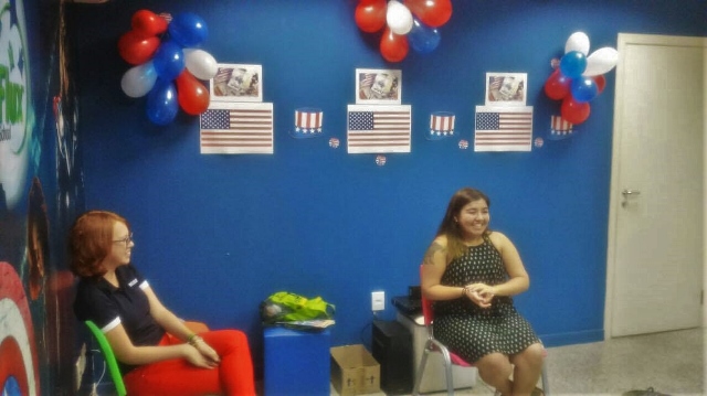 Os participantes tiveram a oportunidade de conversar com Kierstian, nativa do estado do Texas. Ela abordou as diferenças culturais entre o Brasil e os Estados Unidos, e como os americanos comemoram o Independence Day.