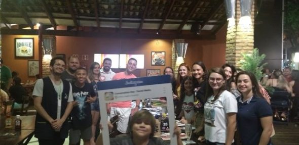 Em um restaurante da cidade os alunos se divertiram falando sobre um assunto muito popular hoje em dia: as mídias sociais. Os participantes fizeram disputa de melhor stories através do Instagram da escola, fizeram um Quiz para saber qual mídia social se identificava mais com a personalidade de cada um, fizeram um teste para saber se os alunos cometem muitas gafes nas redes sociais, uma disputa de legenda de fotos e criação de memes da internet. A aluna Alana do Book 1 disse que se divertiu muito e que foi uma ótima oportunidade para colocar o inglês em prática. A aluna Lais também do Book 1 disse que conseguiu entender toda a atividade e conseguiu fazer tudo que foi proposto. O aluno Vitor do Book 4 levou seus dois filhos que também estudam inglês e eles disseram que foi muito divertido. Foi uma noite de muita conversação e depois de tanto bate papo os alunos puderam se deliciar com hambúrgueres, hot dogs e batatas fritas.
