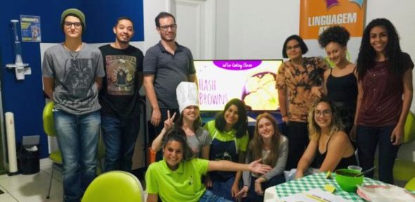 A turma toda colocou as mãos na massa para fazer a iguaria, aprenderam e praticaram o vocabulário, expressões e chunks mais usados na cozinha. Também conheceram mais sobre a cultura dos países que falam o inglês!