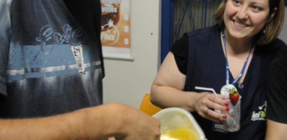 Eles aprenderam a preparar um delicioso milk-shake de morango com calda de morango e chocolate e a enfeitar os copos para servir o milk-shake com estilo.