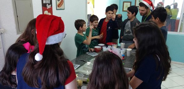 A atividade iniciou com uma aula apresentando o vocabulário e os comandos necessários para a execução da receita, em seguida, todas as crianças foram para a cozinha, pôr a mão na massa e aprender na prática. Foram duas horas de muita diversão, bagunça e aprendizado. Os participantes arrasaram na confecção dos biscoitos natalinos.