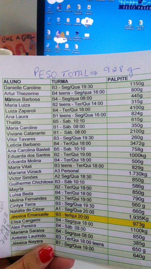 O peso revelado foi de 928 gramas, e quem chegou mais próximo deste peso, “chutando” 973 gramas, foi a aluna do Book 3, Jéssica Emanuella. Congratulations Jéssica!