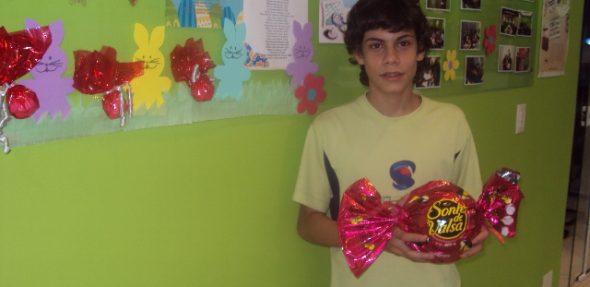 O aluno João Victor Livorati Costa da inFlux Xaxim foi o ganhador do ovo de Páscoa na brincadeira ” How many eggs?” / ” Cuantos huevos de chocolate?” onde os alunos tinham que adivinhar quantos ovinhos de chocolate havia dentro de um recipiente.