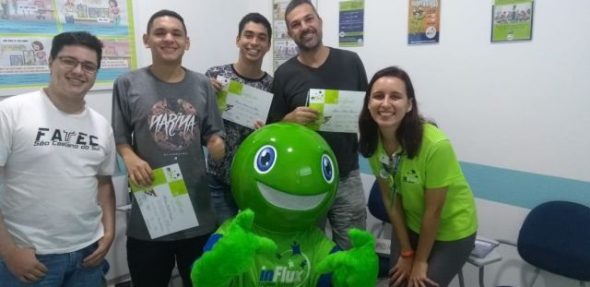 Os queridos alunos da inFlux São Bernardo do Campo receberam uma ilustre visita neste início de semestre: o Fluxie. Que compareceu para entregar os certificados de conclusão do último módulo cursado pelos alunos, que conquistaram com esforço e dedicação.