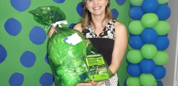 Em segundo lugar, a vencedora foi a aluna Amanda de Lima, do book 3, que levou pra casa o kit número 2, com um dicionário, uma caneca personalizada inFlux e um chaveiro Fluxie. E o aluno Fábio Borba que levou pra casa o kit número 3, uma caneca personalizada inFlux, um boné inFlux e um chaveiro Fluxie.