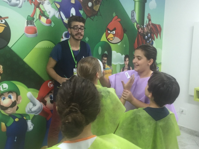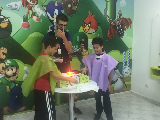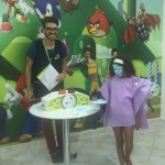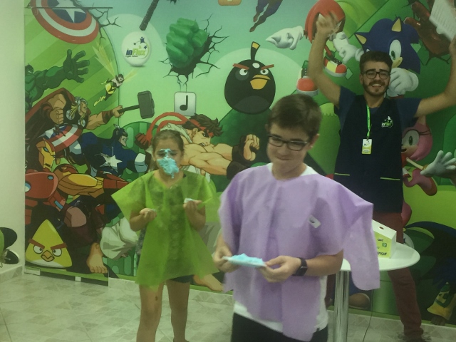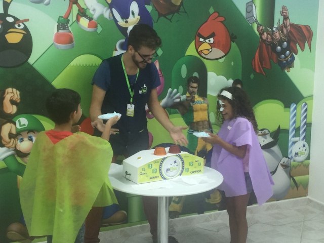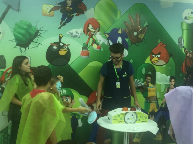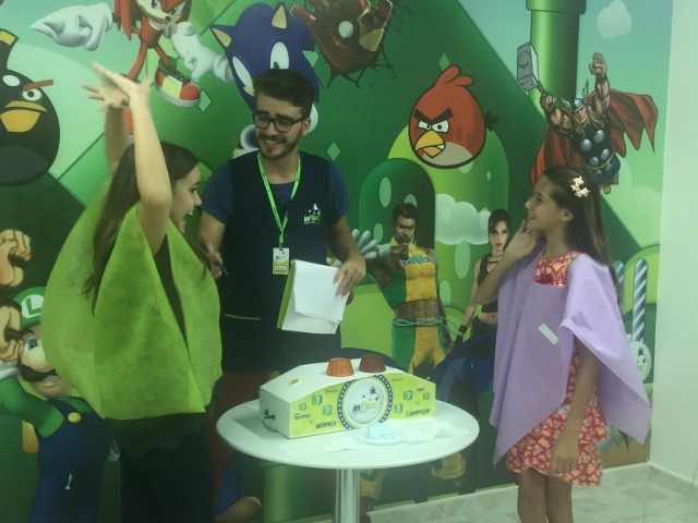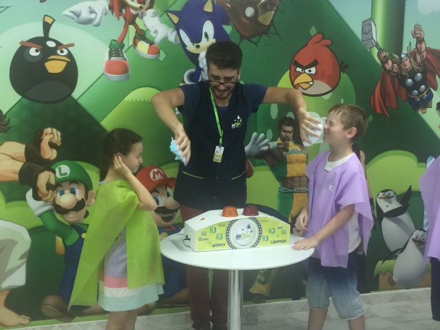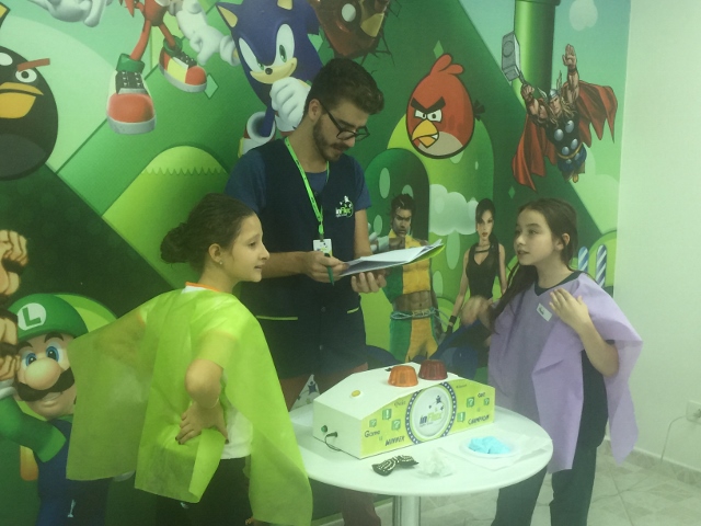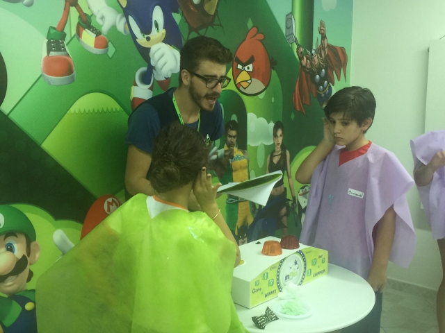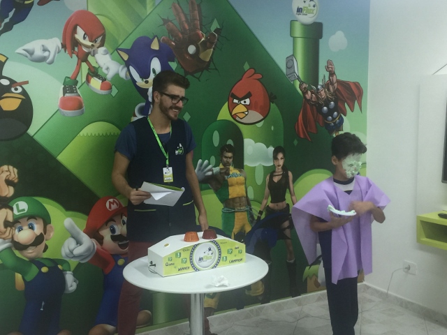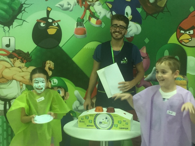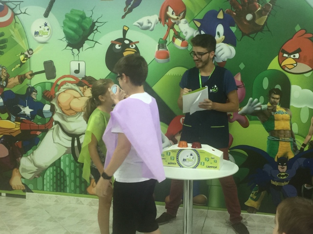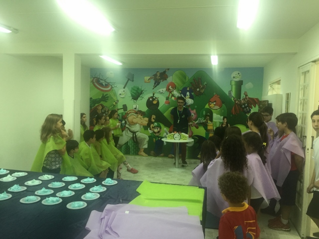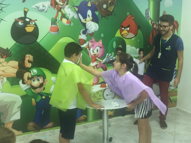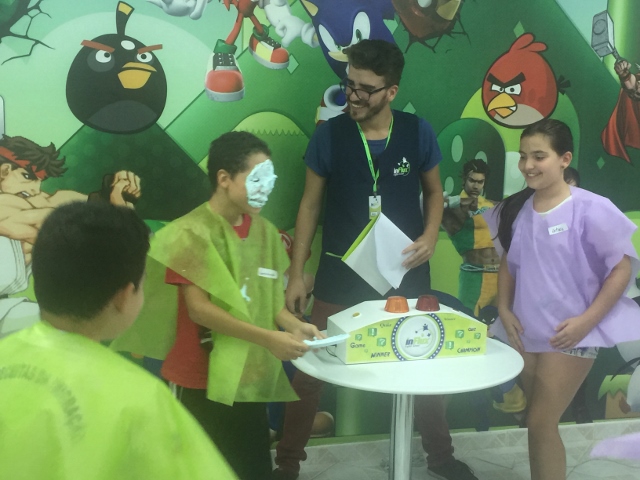 Nossas turmas de Backpack e Junior arrasaram no Quiz. Além de praticarem o inglês, se divertiram dando torta na cara dos amigos. E não tem essa de: “na dúvida não responde”. O teacher Rômulo ficou encarregado de dar tortadas na dupla que não respondeu.