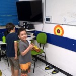 A teacher Taísa preparou uma aula muito divertida. Ela levou um “tiro ao alvo” e colocou umas imagens espalhadas na sala. Os alunos tinham que adivinhar o que era aquela imagem e depois repetir a estrutura que estava escrita na parte posterior da imagem.