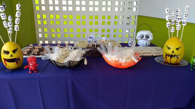 Muitos personagens, bolo de cemitério, pão de múmia, melões zumbis, marshmallows fantasmas, ponche sangrento e muito mais! Sem falar nas músicas assustadoras e brincadeiras com nosso Fluxie.