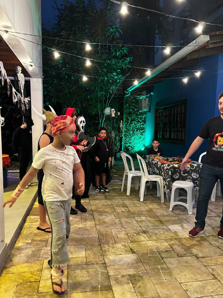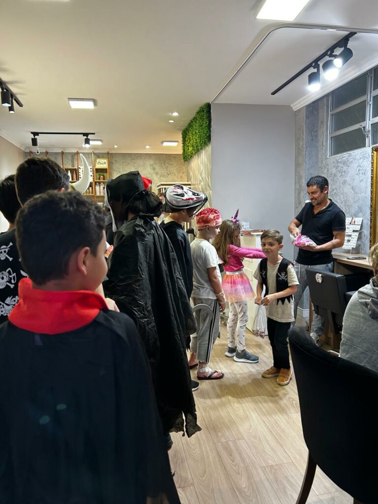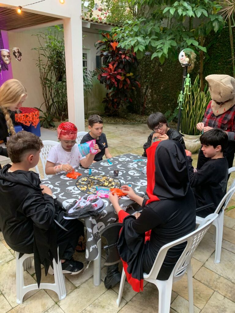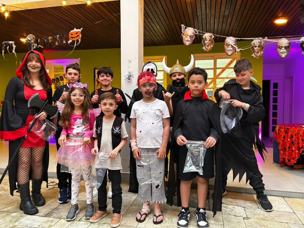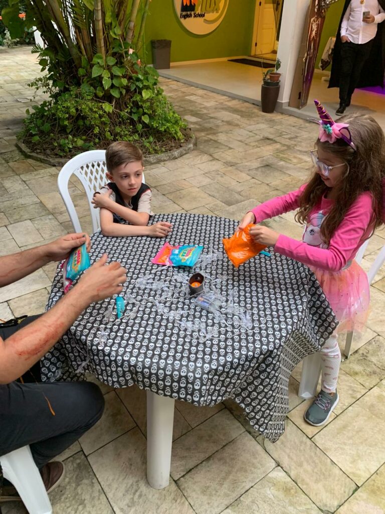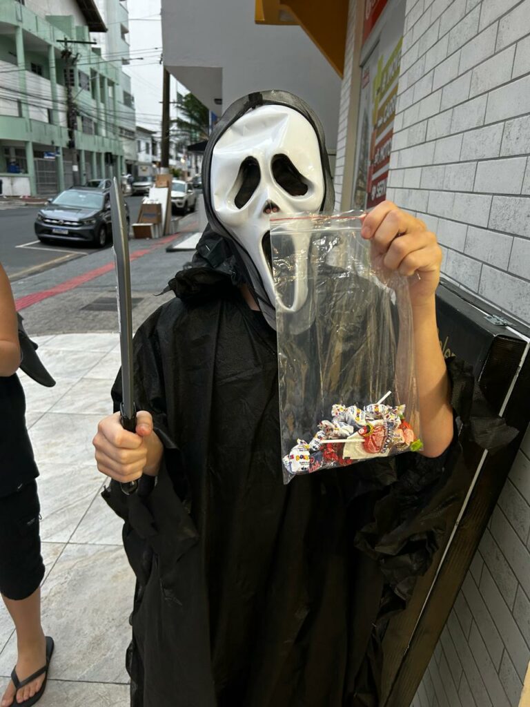 A atividade começou com a criação de decorações de Halloween feitas com massinha de E.V.A., seguida do clássico Trick or Treat, em que os alunos visitaram estabelecimentos próximos à escola para coletar doces.