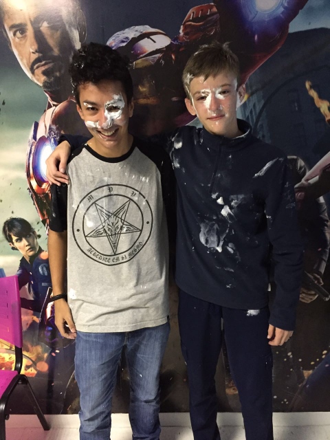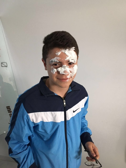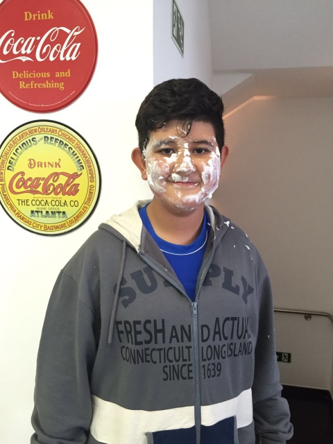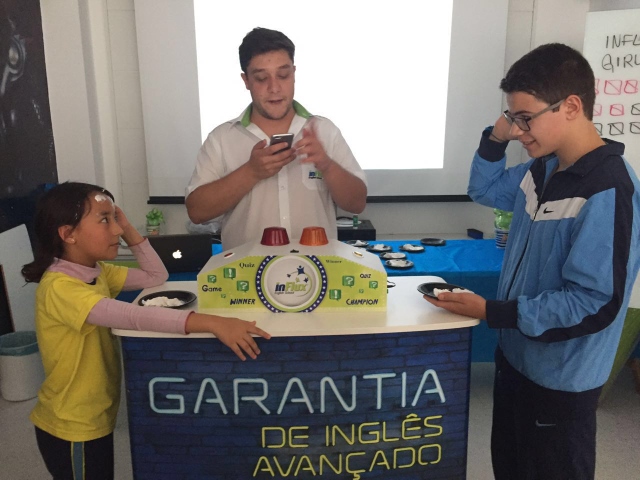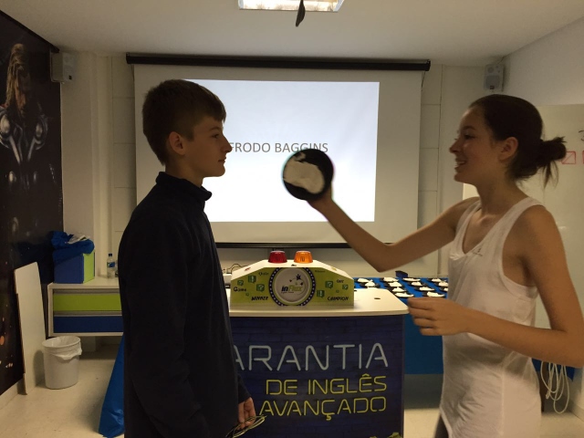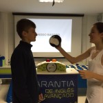 Os alunos praticaram Inglês, enquanto respondiam perguntas desafiadoras sobre filmes, e, caso a resposta estivesse incorreta, o resultado era uma torta na cara.