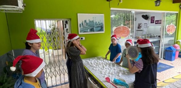 A atividade aconteceu pela manhã e pela tarde, e foi recheada de jogos como The Grinch Among Us, onde os alunos precisavam descobrir quem era o Grinch que estava roubando o Natal dos elfos. Treinamos expressões de natal num Memory Game, e tivemos competições como Cotton Balls Game, quem conseguia pegar mais algodão com uma colher vendado, The Cup Catch, onde duplas precisavam acertar um copo dentro de outro copo segurado pelo amiguinho, e o ultimo jogo foi um Empilhamento de Copos usando apenas um balão para carregar o copo, sem poder enconstar com as mãos.