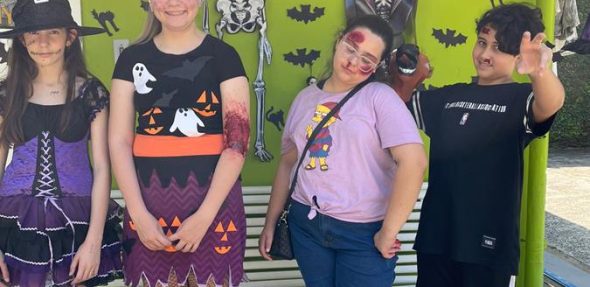 Os alunos da inFlux Blumenau Centro se reuniram aqui na escola para celebrar o Halloween.
