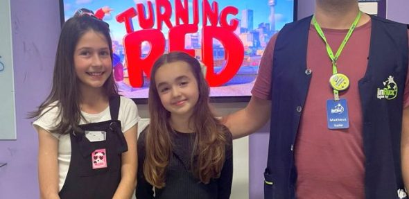 Eles aprenderam a solicitar os ingressos, escolher o filme, comprar as guloseimas e por fim, se divertiram com o filme escolhido – Turning Red (Disney).